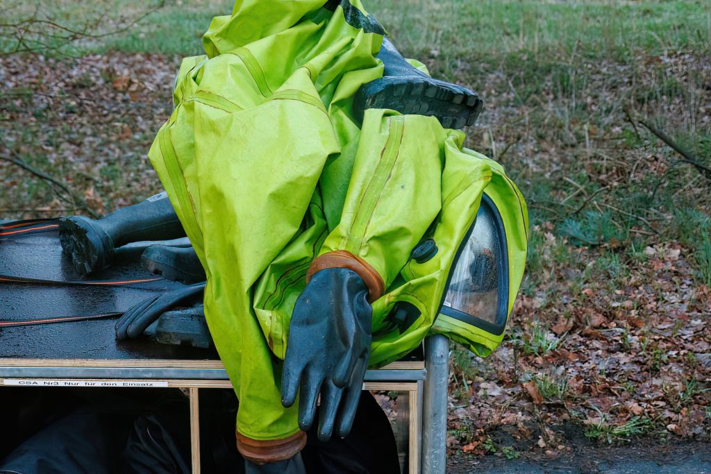 Ebenfalls parallel zur Menschenrettung und zum Aufbau der Dekontaminationsstrecke, machten sich CSA-Träger (Chemikalienschutzanzug) bereit, um das weitere Austreten des Stoffes zu verhindern und diesen ggf. mittels einer Membranpumpe in ein neues Gefäß umzufüllen. Der erste Trupp ging unter CSA zur weiteren Erkundung vor und stellte dabei fest, dass ein Abdichten der beschädigten Fässer nicht möglich ist und forderte daraufhin die Membranpumpe an. Diese muss vom Trupp wiederum selbst an der Absperrgrenze abgeholt werden, damit so wenig Personal wie möglich den Gefahrenbereich betritt. Für den Notfall steht jedoch jederzeit ein zweiter Trupp unter CSA bereit, um den ersten Trupp im Falle eines Notfalls zu retten. Da auch diese Notfälle geübt werden sollen, trat der Fall ein, dass ein CSA-Träger bewusstlos zusammenbrach. Daraufhin setzte sein Trupppartner eine Mayday-Meldung ab, woraufhin zügig der Sicherheitstrupp kam, um gemeinsam den verunfallten Kameraden zu retten. Ein Kraftakt sowohl für die drei CSA-Träger, welche den Verletzten tragen müssen als auch für das Personal an der Dekontaminationsstelle, welches den Verunfallten aus seinem Schutzanzug befreien muss, die Maske und das Atemschutzgerät abnimmt und zeitgleich eine notdürftige Dekontamination durchführt, damit eine Verschleppung des Giftstoffs verhindert wird. Anschließend wird der Verletzte vom Rettungsdienst übernommen. In diesem Fall von der DRK-Bereitschaft, welche mit einem RTW und einem KTW vor Ort war.