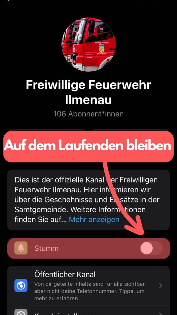 Um direkt per Nachricht über alles informiert zu werden, könnt ihr die standardmäßige Stummschaltung deaktivieren. Wir informieren dort nicht nur über Einsätze und Veranstaltungen aus der Samtgemeinde, sondern auch über laufende Einsätze, Straßensperrungen durch die Feuerwehr oder Bürgerinformationen bei Großschadenslagen in der Samtgemeinde.