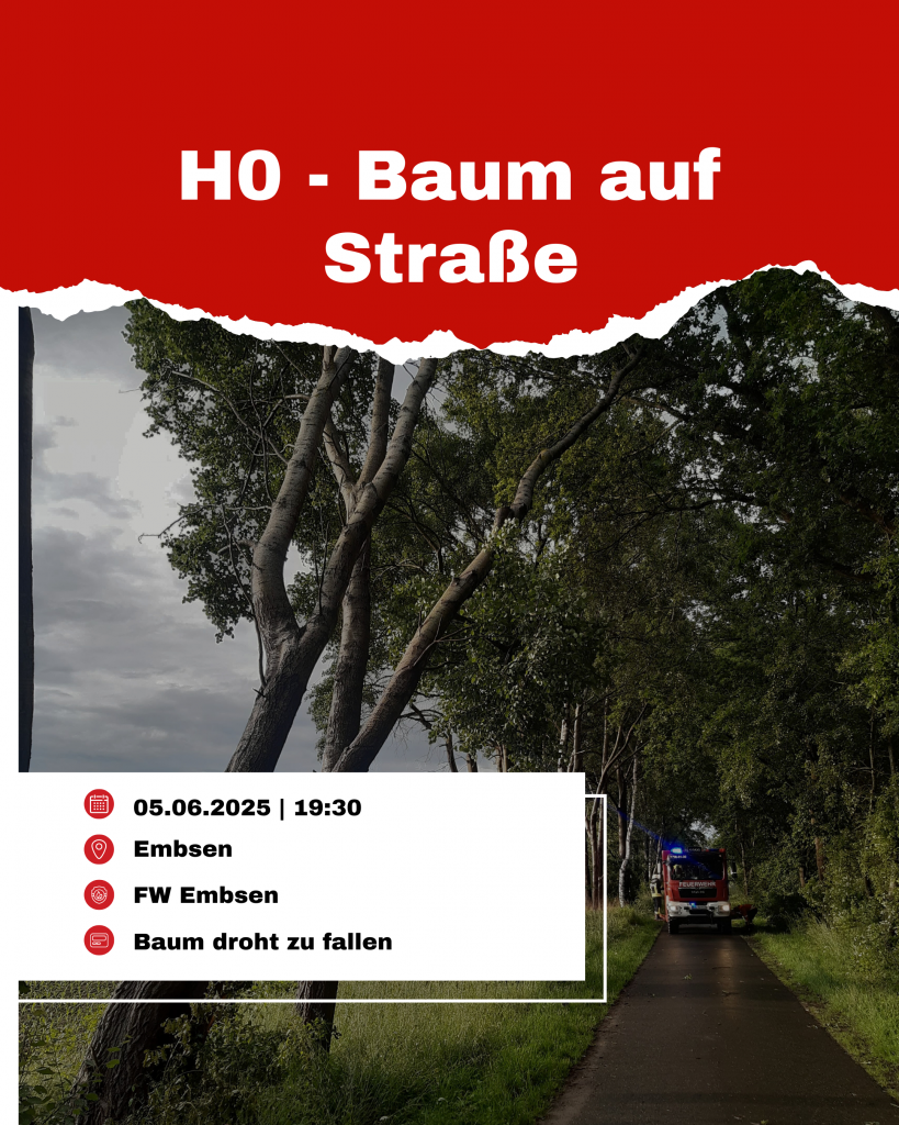 Am Abend des 05.06.2025 wurden der Feuerwehr Embsen durch Passanten Bäume gemeldet, die drohten auf die Straße „Zum Achterbruch“ zu fallen. Da sich einige Feuerwehrleute für eine Besprechung getroffen haben, machten sich fünf von ihnen direkt auf den Weg.