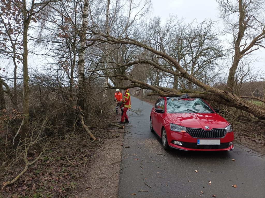 Am 24.01.2024 wurde um 10:37 Uhr die Feuerwehr Kolkhagen mit dem Stichwort H1 – Baum auf Straße, Baum auf parkendem PKW alarmiert. An der Einsatzstelle stellte sich heraus, dass das Fahrzeug auf der Straße am Bokenkamp stand und trotz eingeleiteter Bremsung einem durch den Sturm umstürzenden Baum nicht mehr ausweichen konnte. Der Baum landete auf dem Dach des PKWs. Der Fahrer konnte unverletzt aussteigen und die Feuerwehr alarmieren.