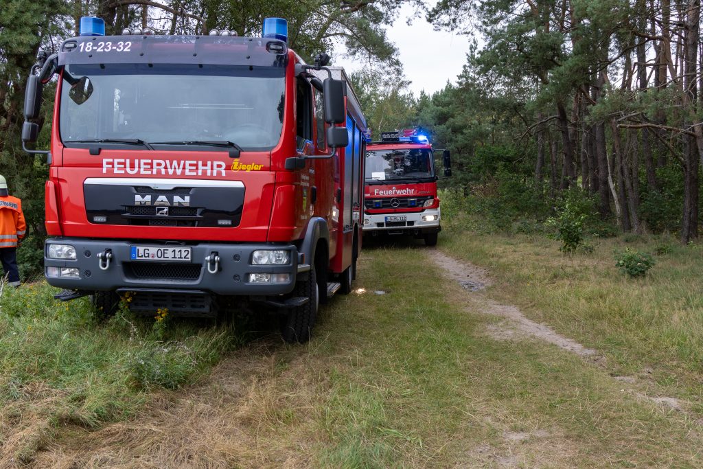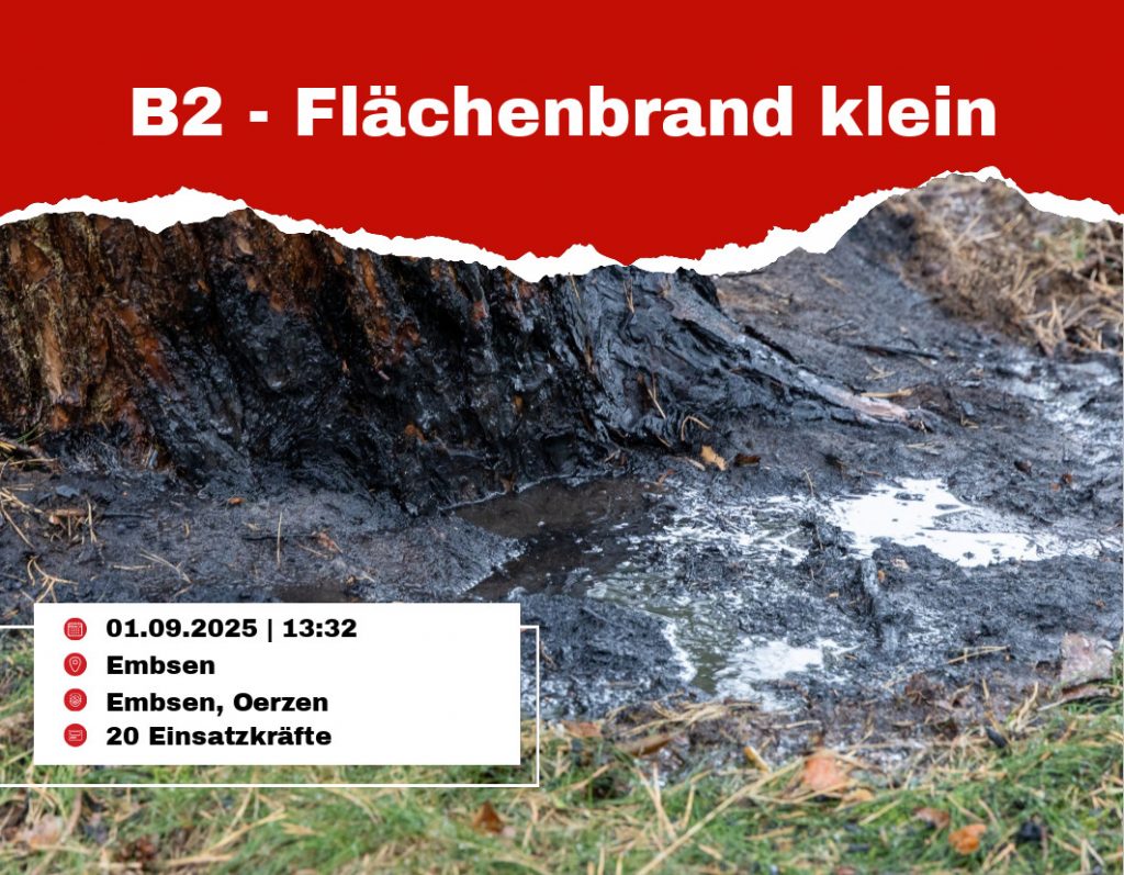 Am Montagnachmittag, den 1. September 2025, wurden die Feuerwehren Oerzen und Embsen um 13:32 Uhr zu einem gemeldeten Flächenbrand in Embsen alarmiert. Hinter dem dortigen Fahrsicherheitszentrum hatte ein Baum Feuer gefangen. Beim Eintreffen der Feuerwehr Oerzen handelte es sich um einen Entstehungsbrand, der umgehend mit einem C-Strahlrohr abgelöscht werden konnte. Anschließend wurde die Einsatzstelle mithilfe einer Wärmebildkamera kontrolliert und mit Kleinwerkzeug gezielt nach Glutnestern durchsucht. Nachdem keine weitere Gefahr festzustellen war, wurde die Einsatzstelle an die Polizei übergeben. Der Einsatz endete um 14:04 Uhr.