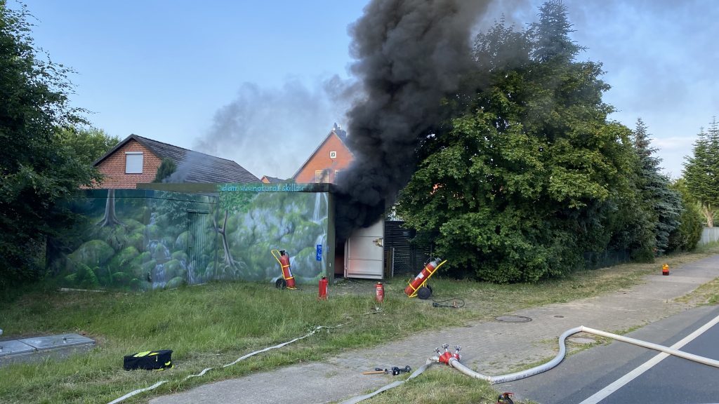 So lautete unser Einsatzstichwort gestern Abend (07.06.2023) um 18:41 Uhr. Gemeinsam mit der Feuerwehr Oerzen wurden wir zu einer Umspannstation an der K10 in Richtung Oerzen auf Höhe des Fasanenwegs gerufen.