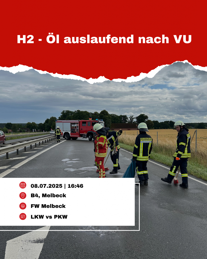 Am Nachmittag des 08.07.2025 wurde die Ortswehr Melbeck auf die B4 zwischen Lüneburg und Melbeck alarmiert, wo es zu einem Unfall zwischen LKW und PKW kam.