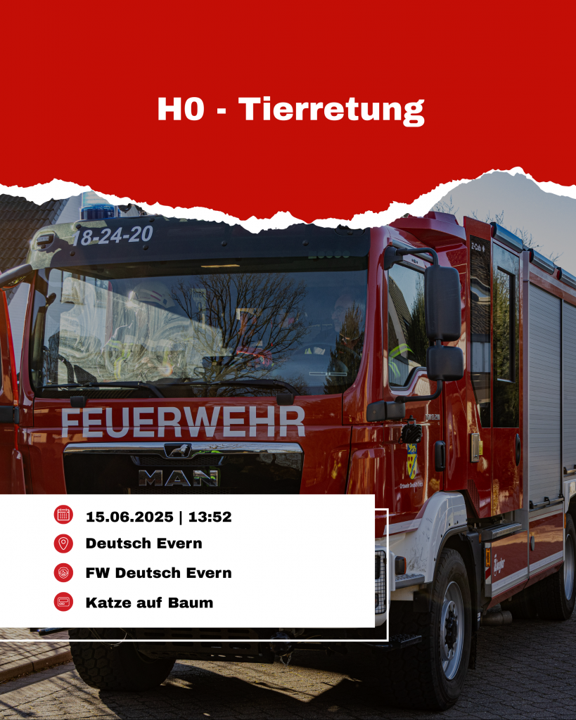 In den Mittagsstunden des 15.06.2025 wurde die Feuerwehr Deutsch Evern zu einem Einsatz gerufen, der wohl als Klassiker schlecht hin gilt, in der Realität doch aber sehr selten vorkommt – eine Katze saß auf einem Baum fest und kam nicht mehr herunter. Mittels Steckleiter konnte die Rassenkatze, die mit ihrer Leine verheddert war, von den 10 Einsatzkräfte aus etwa 3,5m gerettet und wohlauf an den Besitzer übergeben werden. Weitere 7 Einsatzkräfte waren im Feuerwehrhaus bereit, mussten aber nicht mehr tätig werden. Der Einsatz dauerte rund 15 Minuten.