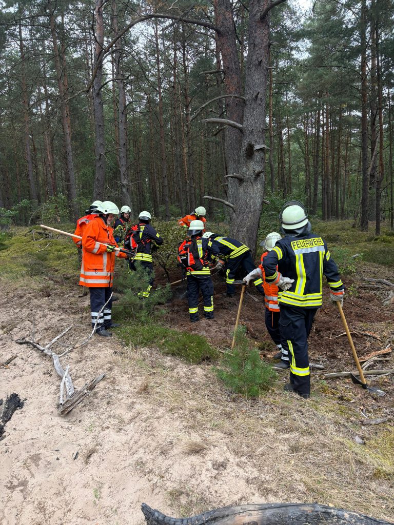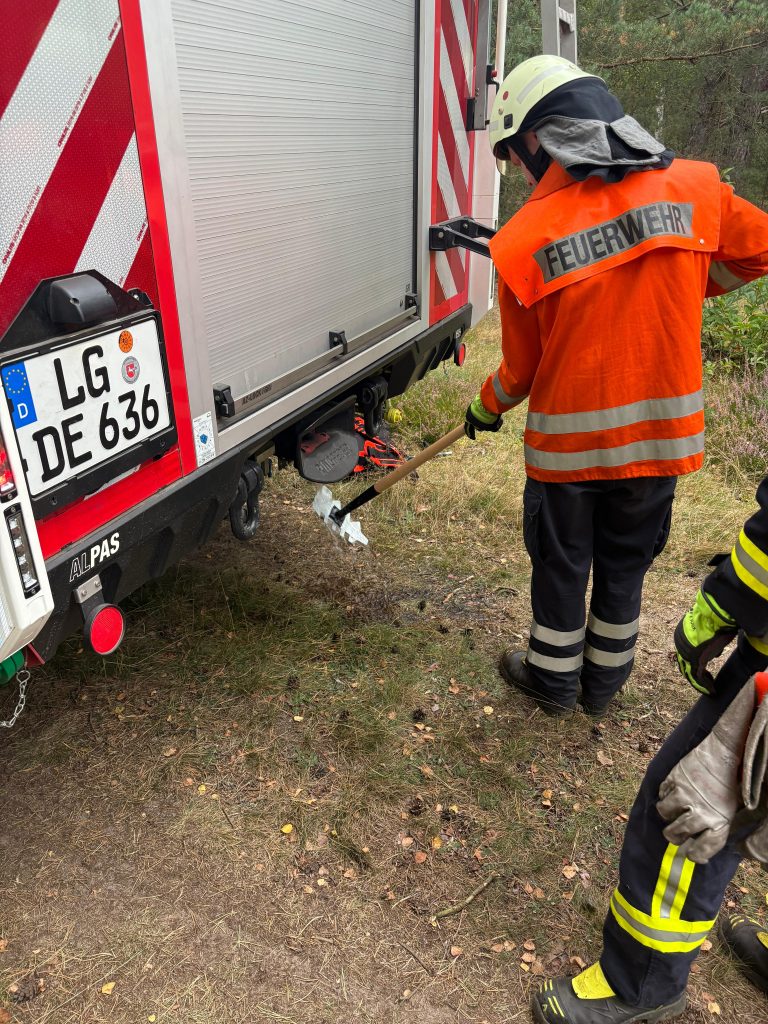 Beim Eintreffen der Feuerwehr war das Feuer bereits größtenteils erloschen. Die Einsatzkräfte löschten verbliebene Brandstellen mit Löschrucksäcken und Kleinwerkzeug ab und kontrollierten den Bereich sorgfältig auf Glutnester. Dank der guten Zusammenarbeit zwischen der Bundeswehr und den beiden Ortswehren konnte der Einsatz zügig beendet werden.