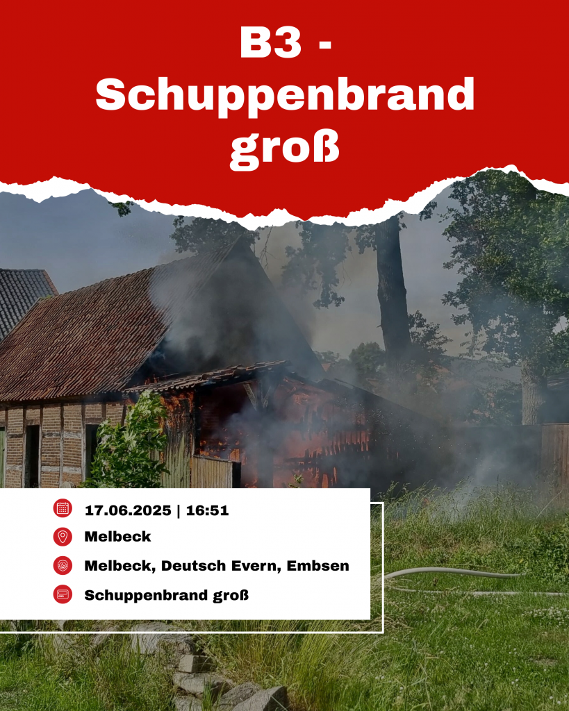 Am 17.06.2025 um 16:51 Uhr wurde die Feuerwehr Melbeck zu einem Schuppenbrand nach Melbeck alarmiert. Aufgrund der massiven Rauchentwicklung, die eine Anfahrt auf Sicht möglich machte und der ersten Lageerkundung wurde um 16:56 Uhr das Stichwort auf B3 erhöht, wodurch ebenfalls die Ortswehr Deutsch Evern sowie der Einsatzleitwagen aus Embsen alarmiert wurden.