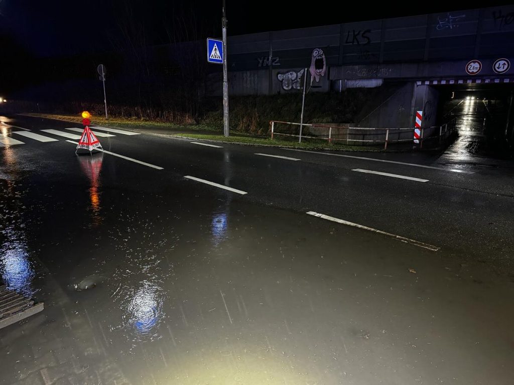 Die Einsatzkräfte sperrten die Straße und reinigten die Regenwasserabläufe. Das Oberflächenwasser konnte dann kontrolliert in die dafür vorgesehene Kanalisation ablaufen.