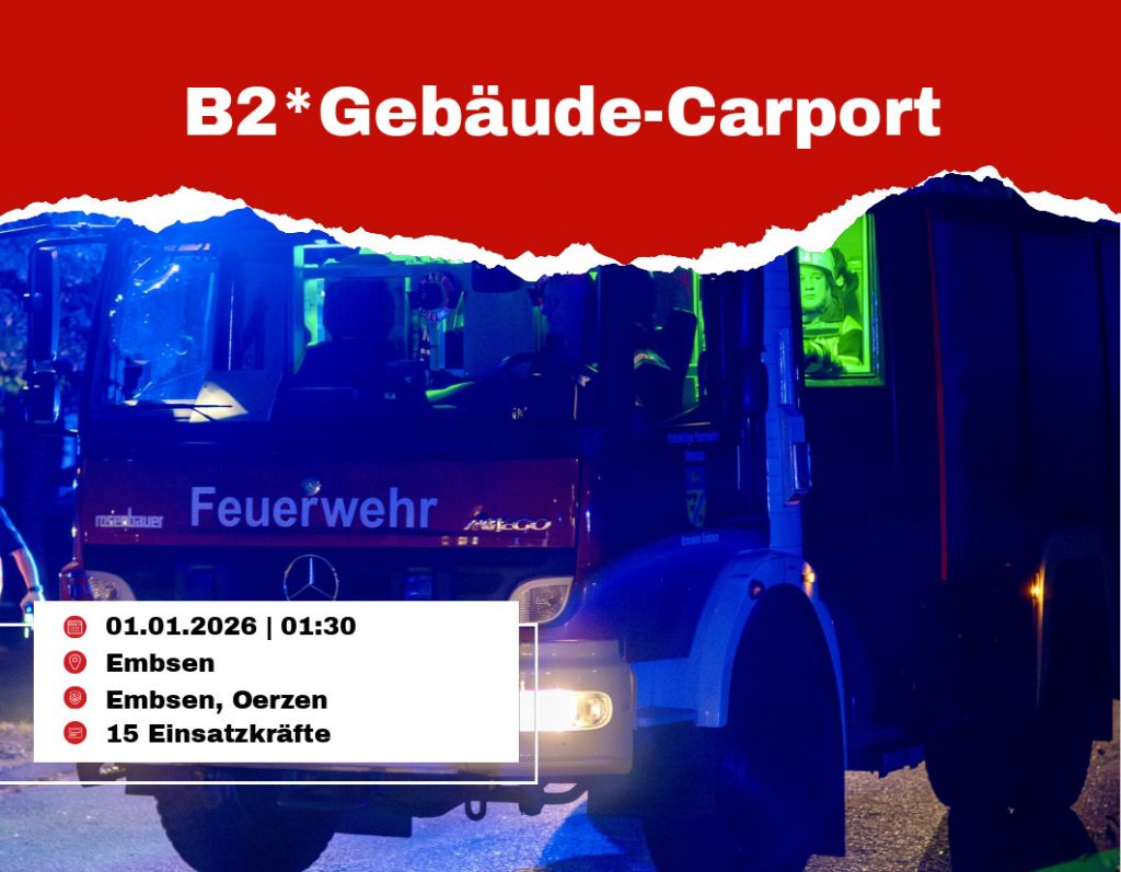 In der Silvesternacht um 01:30 Uhr wurden die Feuerwehren Embsen und Oerzen zu einem gemeldeten Carportbrand in ein Embsener Wohngebiet alarmiert. Ein Nachbar, ebenfalls Feuerwehrmann aus Embsen, wurde durch seinen Hund auf die bereits über 2m hohen Flammen aufmerksam gemacht, die aus der Mülltonne schlugen und drohten auf das Carport überzugreifen. Er rief die Feuerwehr und eilte anschließend mit einem Feuerlöscher zu seinen Nachbarn. Ein ebenfalls vorbeikommender Autofahrer alarmierte zeitgleich die Bewohner des Hauses, welche anschließend mit einem Gartenschlauch Löschmaßnahmen einleiteten.