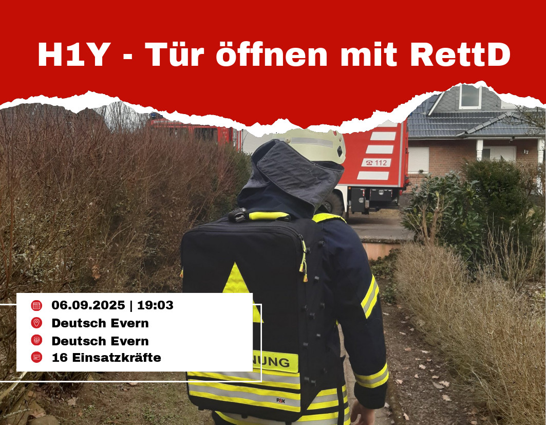 Am Samstagabend, den 6. September 2025, wurde die Feuerwehr Deutsch Evern um 19:03 Uhr zu einer Türöffnung in Zusammenarbeit mit dem Rettungsdienst alarmiert. In einem Wohnhaus lag eine Person im Hausflur, sodass zunächst von einer hilflosen Lage hinter verschlossener Tür ausgegangen werden musste. Noch vor einem Eingreifen der Feuerwehr konnte die betroffene Person jedoch eigenständig aufstehen und die Tür selbstständig öffnen. Anschließend wurde sie vom Rettungsdienst medizinisch untersucht. Für die Feuerwehr war kein weiteres Handeln notwendig, und der Einsatz konnte um 19:30 Uhr beendet werden.